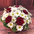 Великолепное сочетание эффектных красных роз и наивных белых хризантем, помещенное в плетеную белоснежную корзину, умело дополнено рускусом и гипсофилой.