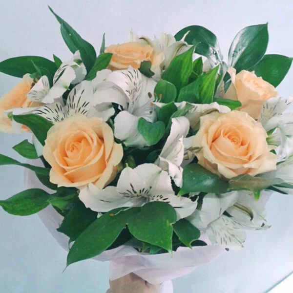 Букет выполнен из нежных кремовых роз, в дополнении кристально - белой альстромерии в окружении декоративной зелени, фетра в тон букету и розового банта.