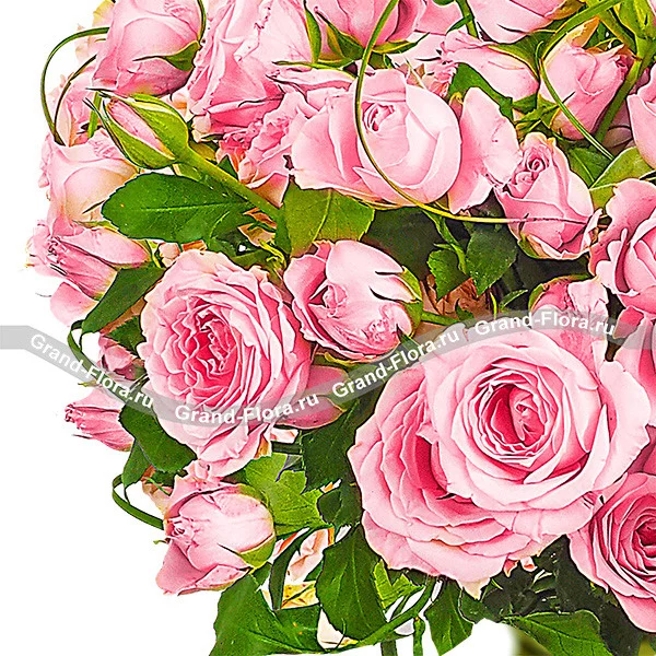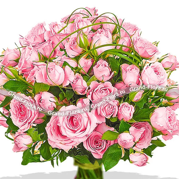 Стандартный (на фото): роза кустовая розовая - 9 шт, декоративная зелень, упаковка, лента розовая. Примерный размер: 25Х25 см.
